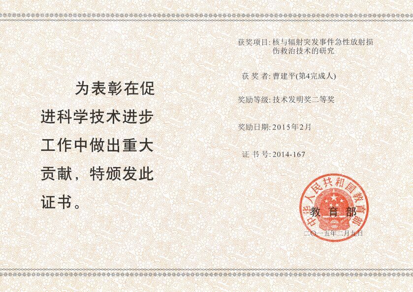 技术发明奖 | 2 | 核与辐射突发事件急性放射损伤救治技术的研究 | 杨占山,张舒羽,许玉杰,曹建平,朱南康,舒泉水 | 苏州大学 |