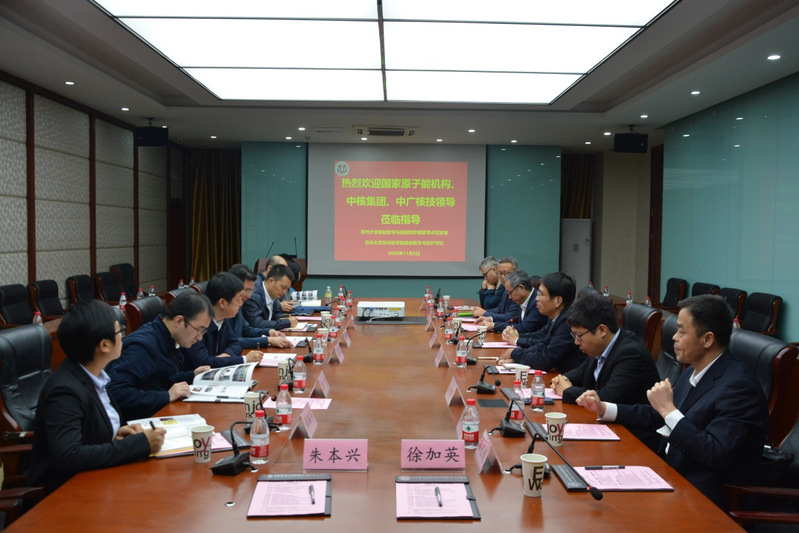 王成奎代表苏大放医学院和放医国家重点实验室对国家原子能机构、中核集团、中广核技领导一行表示热烈欢迎,对各上级部门领导长期以来对苏大放医的大力支持表示衷心感谢。王殳凹介绍了国重室的情况,主要包括历史沿革、研究方向、目标定位、人才团队、平台建设、科研成果、合作交流及社会服务等。周光明介绍苏大放医人才培养工作,包括放射医学招生规模、就业需求以及专业分方向医学物理培养情况等内容,同时专门汇报了中能多粒子超导医学研究加速器的推进工作。