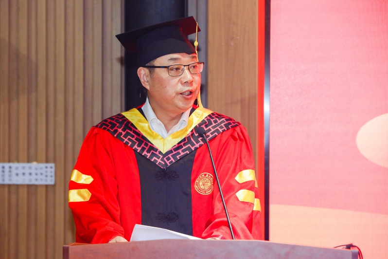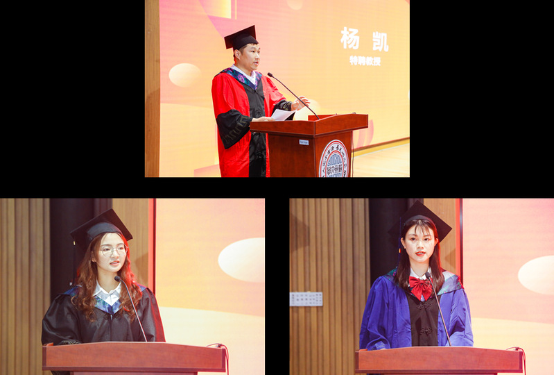 导师代表杨凯老师首先代表各位导师,对顺利取得博士、硕士和本科学位的同学们表示祝贺。在离别之际,杨凯老师赠送给毕业生四个字:仁、和、精、诚。希望同学们在新的岁月港湾里启航,承载对未来的憧憬和畅想,直挂云帆,乘风破浪。希望在未来日子,母校能以你们为傲。