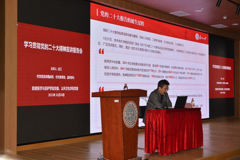 11月16日,校党委宣讲团成员、校党委常委、宣传部长吴江同志为放射医学与防护学院党员师生作了学习贯彻党的二十大精神宣讲报告会。