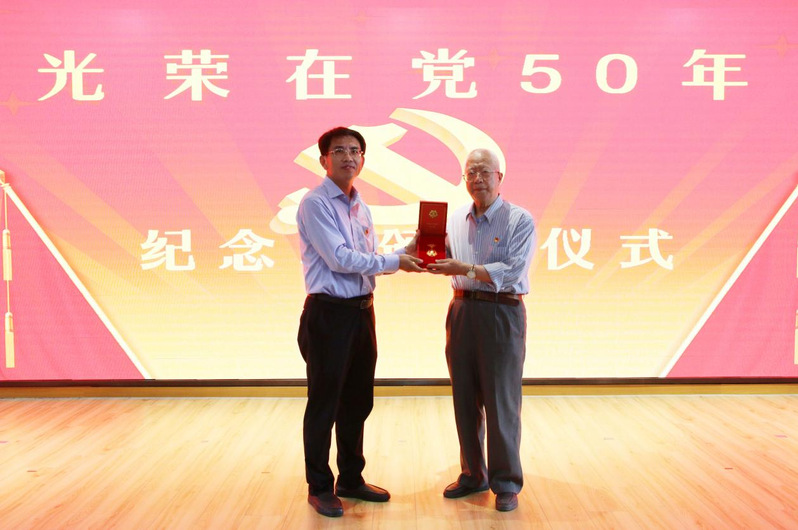 首先,学院党委书记王成奎向学院“光荣在党50年”纪念章获得者,88岁的学院老书记佘桂枝表示热烈祝贺和崇高敬意,向佘桂枝和全体退休党员为学院发展所作贡献表示衷心的感谢,并代表学院党委为其颁发纪念章,学院领导与全体退休党员合影留念。