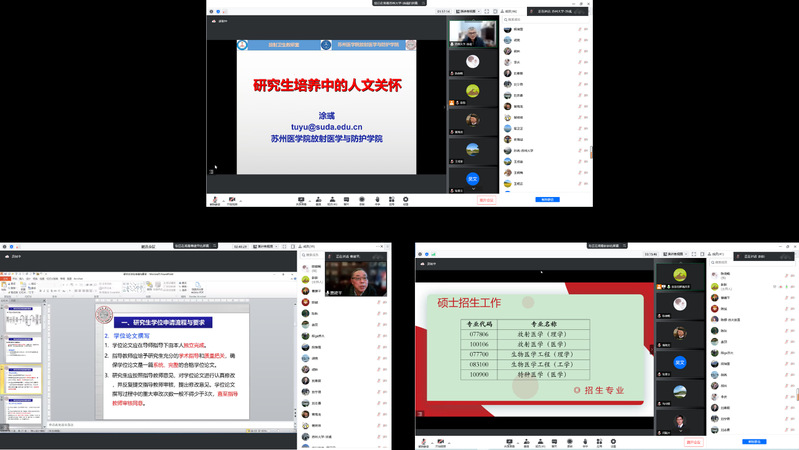 为全面落实研究生导师立德树人职责,增强研究生导师教书育人的责任感与使命感,提升研究生培养过程质量。2022年11月30日,放射医学与防护学院根据国家和学校相关文件精神召开2023年拟上岗招收硕士研究生导师培训会。本次会议以线上线下相结合方式召开,放射医学与防护学院党委书记王成奎、常务副院长曹建平、辐射防护与核安全研究中心主任涂彧教授及学院2023年拟上岗招收硕士研究生导师40余人参加了本次会议。会议由研究生秘书彭蓉主持。