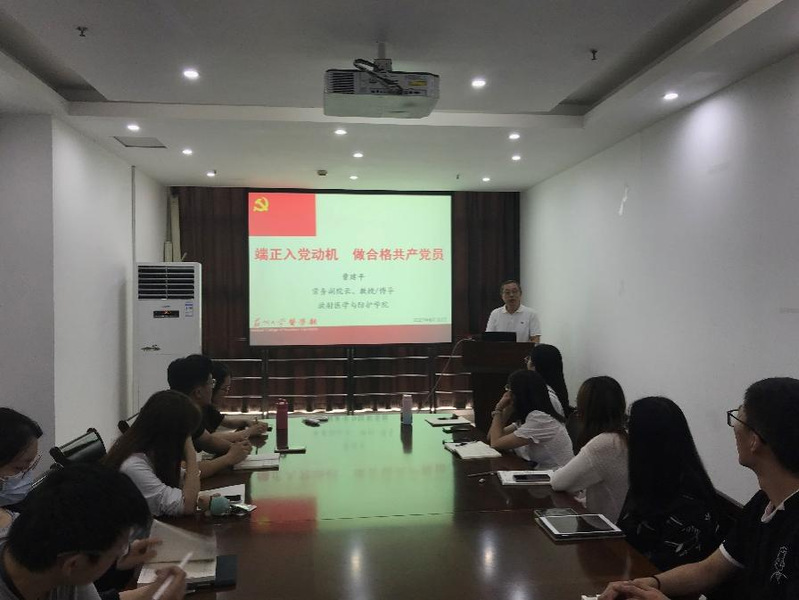 2021年6月30日下午,在庆祝中国共产党成立100周年前夕,医学部放射医学与防护学院党委在学院2楼会议室为全体申请入党的研究生举办了党史学习教育专题党课,学院常务副院长曹建平教授和副院长周光明教授分别从自身科学研究和工作经历等多个维度,为同学们带来了一堂赋有特殊意义的专题党课,专题党课活动由学院专职组织员王加华主持。
