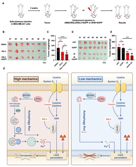 Intracellular free iron ions are primarily regulated by transferrin receptor (TFR), ferroportin 1 (FPN1), and ferritin. Ferritin, composed of ferritin light chain (FTL) and ferritin heavy chain (FTH), can store up to 4,000 iron atoms and maintains intracellular iron homeostasis mainly through the autophagy pathway. In this process, NCOA4 acts as a selective cargo receptor for ferritin, mediating ferritinophagy through phase separation, which is a key mechanism for maintaining intracellular iron homeostasis. This study found that under low mechanical stress conditions, NCOA4 levels significantly decrease, and the co-localization of NCOA4 and FTH1 during phase separation is reduced, ultimately affecting ferritinophagy and its downstream iron metabolism pathways. This discovery further reveals the complex relationship between iron metabolism, autophagy, FTH1 phase separation, and ferroptosis, providing a new theoretical basis for the regulation of ferroptosis by mechanical signaling pathways. In nude mouse xenograft tumor models, the research team further investigated the synergistic effects of the mechanical stress and ferroptosis induction. The results showed that combining tumor stiffening agents (which enhance the mechanical strength of tumor tissue) with ferroptosis inducers or radiotherapy significantly inhibited tumor growth and reduced tumor weight. During the rapid proliferation phase of tumor tissue, the interior of solid tumors often exhibits a high mechanical stress microenvironment due to extracellular matrix remodeling and collagen fiber deposition. This phenomenon suggests that combining ferroptosis inducers with conventional radiotherapy may be an effective strategy for improving the treatment efficacy of solid tumors.