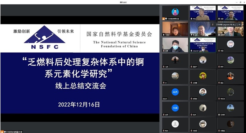 2022年12月16日,国家自然科学基金委重大项目“乏燃料后处理复杂体系中的锕系元素化学研究”2022年度交流会在线上召开。国家自然科学基金委员会化学科学部庄乾坤处长、重大项目负责人苏州大学放射医学与辐射防护国家重点实验室主任、苏州医学院放射医学与防护学院院长柴之芳院士及各子课题负责人、研究骨干等20余人参加会议。