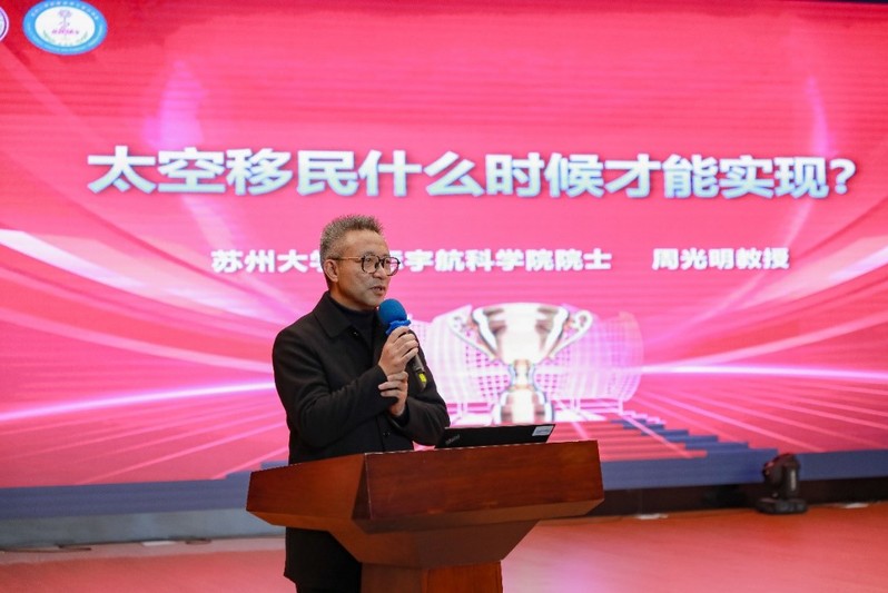 在金鸡湖学校,周光明院士以《太空移民什么时候才能实现?》为题为金鸡湖学校的1000余名师生作精彩讲座。周院士用日常生活中生动有趣的实例讲解了太空移民技术的快速发展和空间辐射可能产生的一些健康问题。在与学生们的互动中,启发了大家的好奇心和想象力。他以自己的经历鼓励同学们要仰望星空,砥砺前行,为实现心中的理想和国家的航天梦想不懈奋斗!
