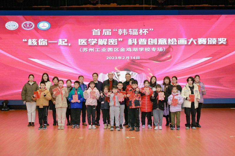 214-17日,苏州大学放射医学与辐射防护国家重点实验室举办的首届韩辐杯核你一起,医学解密科普创意绘画大赛颁奖典礼暨院士专家科普进校园活动,在苏州工业园区金鸡湖学校、星海实验中学、及苏州中学隆重举行。苏州大学苏州医学院放射医学与防护学院副院长、国际宇航科学院院士周光明、放射医学与辐射防护国家重点实验室副主任华道本、国家优秀青年获得者杨凯、国重室综合办主任徐加英等带领的科普团队出席了本次活动。活动得到国重室科普共建学校领导老师们高度重视和大力支持。苏州工业园区金鸡湖学校校长丁雪平、副校长张政、江敏;星海实验中学校长周晓阳、副校长金烨,苏州中学伟长班实验部主任潘波、副主任薛祖鸿等各校师生参加了本次活动。活动分为颁奖和院士专家科普讲座或科普介绍二个环节。