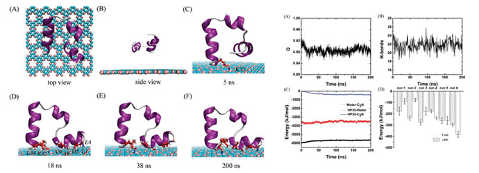 本文作者采用HP35模型蛋白与C2N纳米材料进行分子动力学模拟,结果发现,虽然HP35蛋白会稳定的吸附在C2N纳米材料表面,但其结构仍然保持完整。这种C2N对蛋白质分子结构温和影响特性,完全不同于碳纳米材料如石墨烯,MoS2等完全可以导致蛋白质变性。另外值得关注的是,当HP35蛋白吸附到C2N表面时,基本上被限制在吸附位点上,其横向迁移率较低,这是因为固有的孔状结构导致的,其孔洞附近带负电,可以吸附带正电的氨基酸如Lys,形成锚点以限制蛋白质迁移。这也意味着我们可以将C2N材料用作蛋白固定以及作为潜在的生物纳米医药材料。