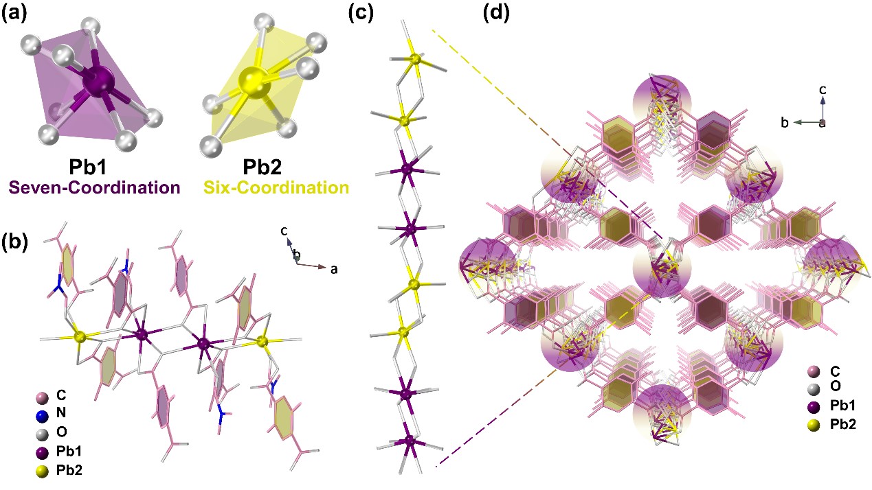 图1. SCU-300的晶体结构图。(a) SCU-300与Pb2+离子和6或7个氧原子具有六、七坐标几何构型的混合配位环境;(b) Pb2+与2,5- DMTA2-配体的混合配位金属中心与配位DMF分子的连接模式图像;(c)由PbO7和PbO6多面体构建的一维链;(d) 1D链的3D排列(为清晰起见,H原子省略)。(颜色代码:Pb紫,O灰,N蓝,C粉,为清晰起见,H原子省略。)