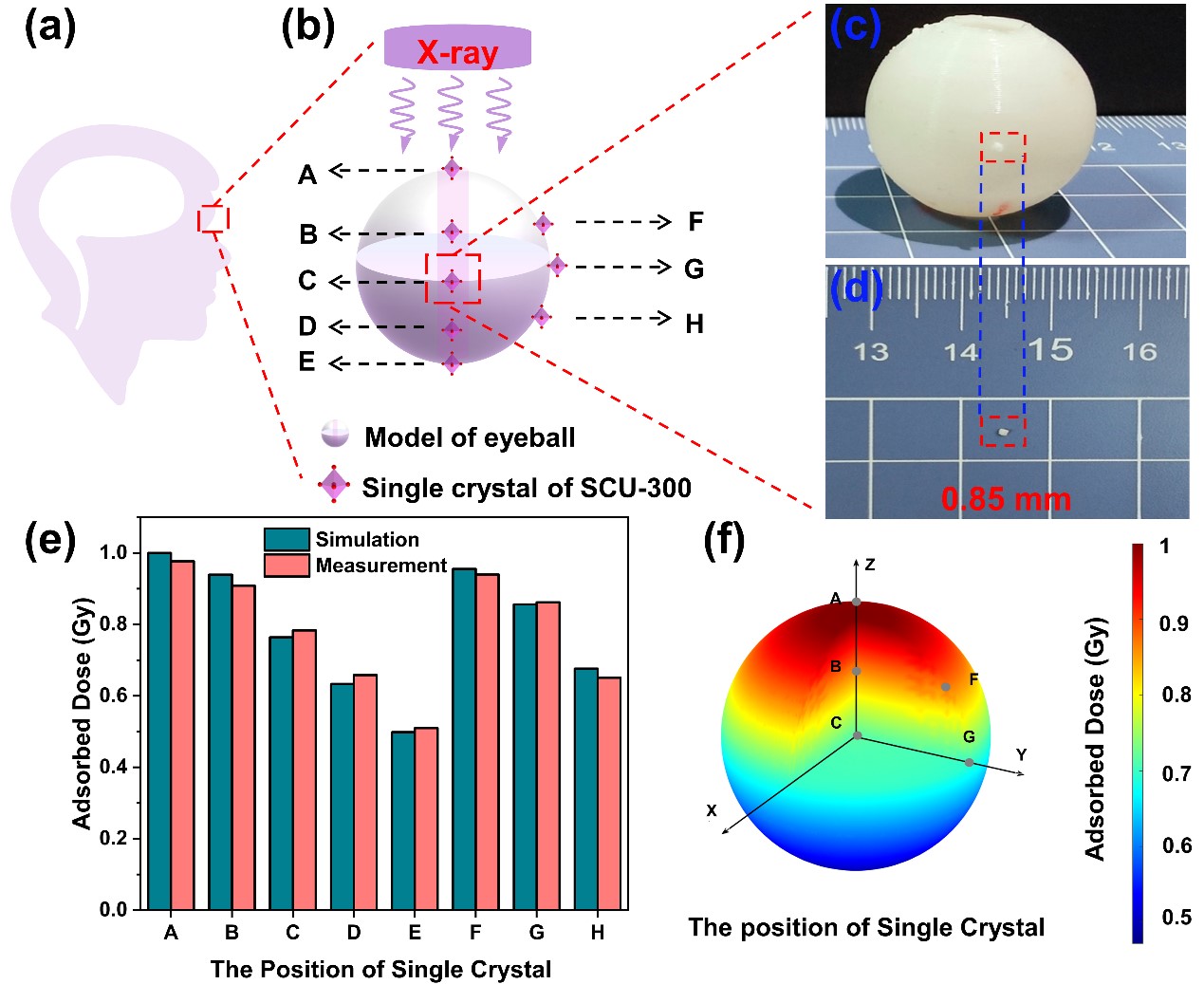 图4. 基于SCU-300的TL剂量计的眼球照射剂量监测.(a)放射治疗微剂量辐射剂量监测示意图;(b)图中显示,在眼球内植入单晶,晶体也固定在眼球的内外表面,使其暴露在X射线辐下;(c)眼球模型的示意图;(d)将SCU-300单晶放置在眼球上进行测试;(e)将蒙特卡罗计算图与实验结果进行比较,包括A到h不同位置的剂量比较;(f)用MATLAB计算并验证了接受1 Gy X射线辐射后组织等效眼球不同部位的剂量分布三维图(为清晰起见,d点和e点省略)。