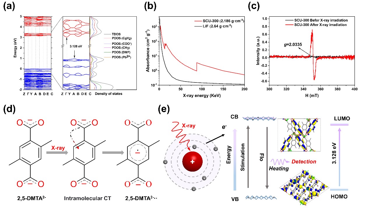 图3. SCU-300的热释光自由基机理阐述.(a)计算的SCU-300的能带结构(左)、总态密度(TDOS)和部分态密度(PDOS)(右);(b) SCU-300纳米晶体的EPR光谱;样品在室温下在以下条件下进行测量:X射线前和X射线后;(c) LiF和SCU-300的吸收光谱与X射线能量的函数关系衰减系数由得到160;(d) CT路径示意图和辐射诱导的自由基形成机制。(e) SCU-300单晶TL理论建模机理示意图;