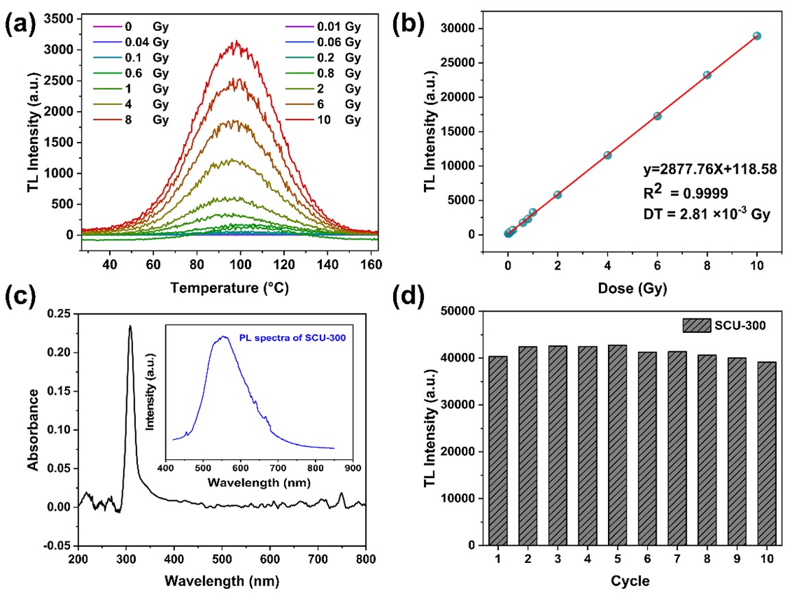 图2. SCU-300的热释光性能。(a) SCU-300剂量计在x射线照射下不同剂量下的TL辉光曲线;(b) SCU-300剂量仪中不同照射率下TL辉光曲线强度的线性关系;(c) SCU-300的365 nm光致发光发射光谱和吸收光谱;(d)同样的照射剂量为10Gy时,SCU-300 TL信号稳定性;