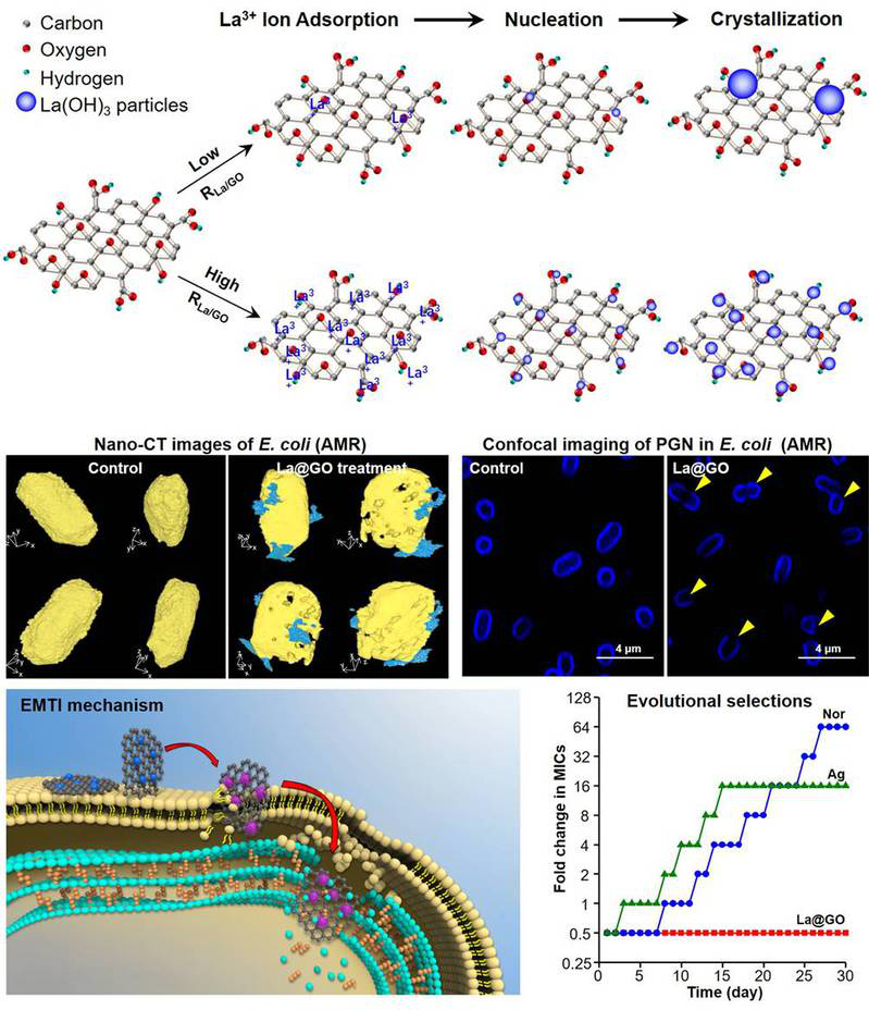 在最新研究中,李瑞宾教授的团队设计一种氧化石墨烯与稀土氧化镧的新型纳米复合材料(La@GO)。利用同步辐射技术,液相色谱-质谱及高分辨荧光显微镜等技术发现,该复合物具有细菌外多靶点侵袭(EMTI)的独特杀菌机制:与细菌膜接触后通过去磷酸化和脂质过氧化作用破坏细菌磷脂层,破坏细菌肽聚糖层。相比抗生素和银纳米粒子,该石墨烯复合物具有两个优势:①La@GO的杀菌性能不受已发现超级细菌耐药机制的影响;②在对超级细菌长期的压力处理下,La@GO不会引发细菌耐药性的进化。