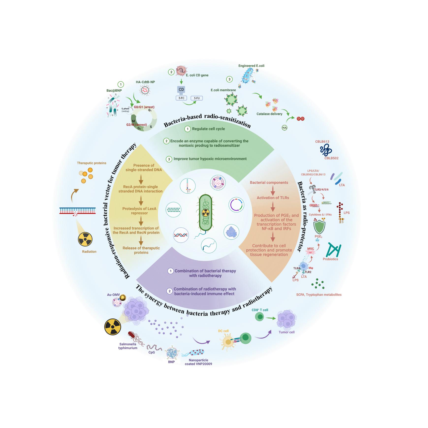 细菌介导的抗肿瘤治疗因其天然的肿瘤靶向能力和特异性的免疫激活特性而受到广泛关注。特别是与放疗等传统治疗相结合,在突破单一治疗的局限性,有效根除肿瘤方面取得了重大进展。细菌及其衍生物根据其不同的生物学特性,既能提高肿瘤放疗的敏感性,又能保护正常组织。此外,基因工程细菌和基于细菌的生物材料也进一步扩大了其在肿瘤放疗中的应用范围,使得细菌疗法能够有着更加广阔的临床前景。