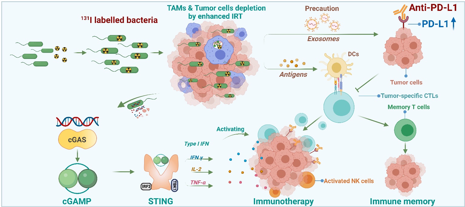 细菌介导的抗肿瘤治疗因其天然的肿瘤靶向性和良好的免疫激活特性而受到广泛关注。活菌和灭活菌都能诱导先天免疫和适应性免疫,进而改变肿瘤免疫微环境。在本研究中,我们使用125I/131I对灭活细菌载体进行放射性