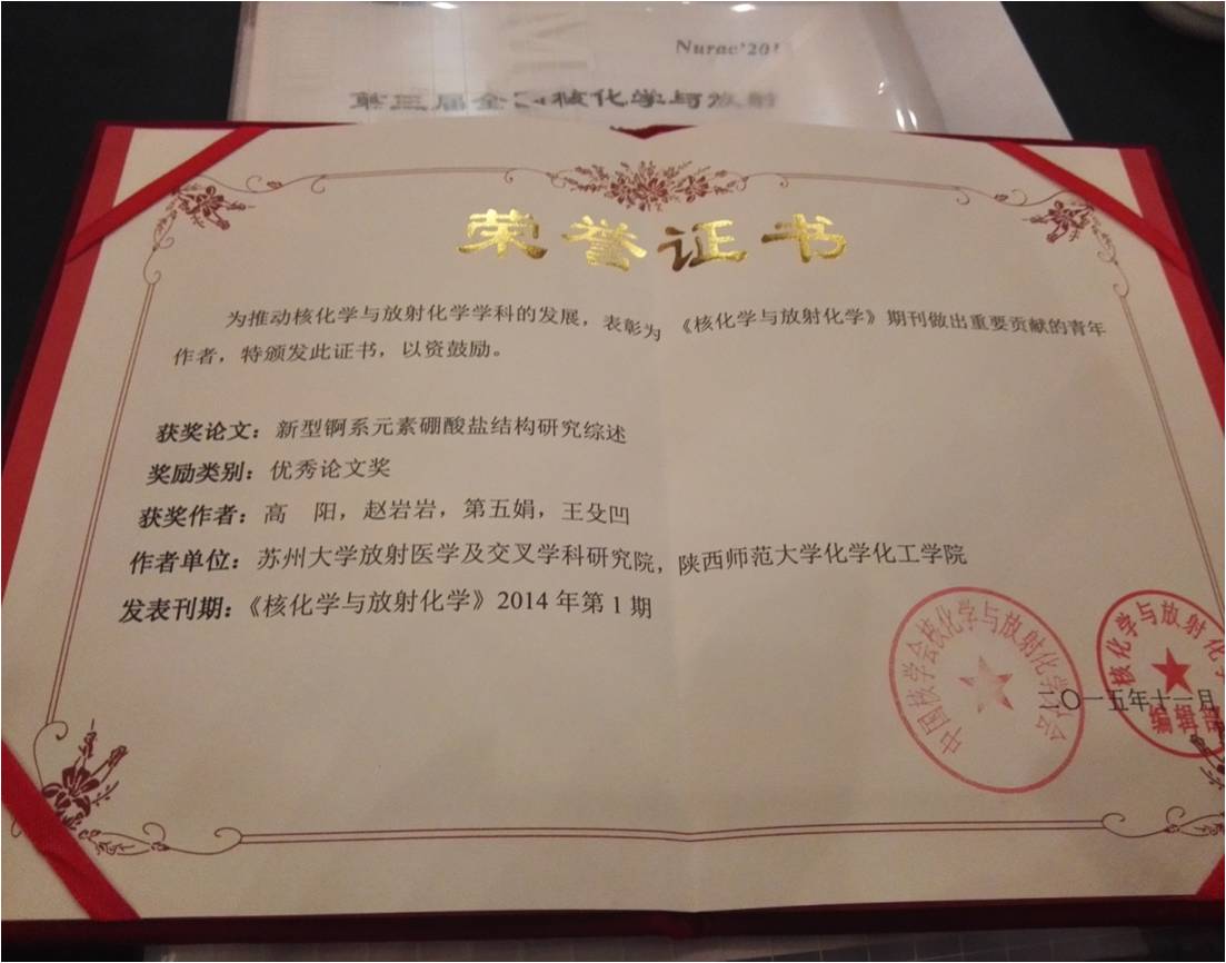 11月27日至12月1日,核能环境化学中心何伟伟、钱骏、王亚星、李玉祥参加在南宁举办的“第三届全国核化学与放射化学青年学术研讨会”。王亚星、李玉祥分别做了题为《Incorporation of soluble radionuclides into crystal lattice》和《有机金属框架中锕系元素配位化学的研究》的口头报告,介绍了课题组关于锕系元素化学方面的工作,与与会同行专家进行了讨论。会议期间,国内放射化学核心期刊《核化学与放射化学》对2014年年度优秀论文进行了表彰,课题组高阳、赵岩岩同学的论文《新型锕系硼酸盐结构研究综述》喜获年度优秀论文奖。