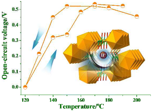 Abstract: The preparation of proton-conducting materials that are functional and stable at intermediate temperatures (393–573 K) is a focal point of fuel cell development. The purely inorganic material, HNd(IO3)4, which possesses a dense 3D framework structure, can reach a maximum of 4.6 × 10–4 S·cm–1 at 353 K and 95% relative humidity and exhibit a high conductivity of 8.0 × 10–5 S·cm–1 from 373 to 553 K under the flow of wet N2. HNd(IO3)4 exhibits a variety of improvements including high thermal stability, low solubility in water, and resistance to reducing atmosphere. The proton conductivity in such a wide temperature range originates from the intrinsic liberated protons in the structure and the resulting 1D hydrogen-bonding network confirmed by bond valence sum calculation and solid-state NMR ****ysis. Moreover, two different activation energies are observed in different temperature regions (0.23 eV below 373 K and 0.026 eV from 373 to 553 K), indicating that two types of proton motion are responsible for proton diffusion, as further domenstrated by temperature-dependent open-circuit voltage hysteresis in a tested fuel cell assembly as well as variable-temperature and double quantum filtered solid-state NMR measurements.