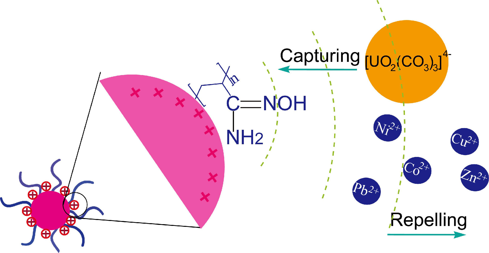 Uranium(VI) is one of the main sources in nuclear energy and may cause severe effect to human health and environment, so it’s important to develop new method and material for uranium capture. A novel approach is reported here for efficient uranium sorption by polyamidoxime-functionalized colloids with Zeta potential-assistance. Specifically, the colloidal particles were prepared via emulsion polymerization with (3-acrylamidopropyl)trimethyl-ammonium chloride (MAPTAC). Zeta potential of the colloids could be controlled by the concentration of MAPTAC. The effects of pH, sorbent dose and competing ions on uranium(VI) sorption were investigated. The sorption process follows pseudo-second-order kinetics and can reach the equilibrium within 3.5 h at pH 7.8. The colloidal particles with high Zeta potentials showed higher selectivity, faster kinetics and larger capacity for the sorption of uranium(VI) in comparison with that of negative Zeta potential. This work may provide a new method for efficient uranium(VI) capture from aqueous solution through Zeta potential-assisted sorption.