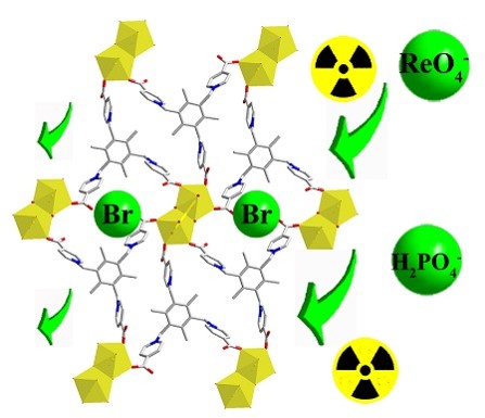 By changing the H2O/DMF content during the self-assemble process of zwitterionic-based ligand with uranyl cations, we observed a structural evolution from a neutral uranyl organic framework [(UO2)2(TTTPC)(OH)O(COOH)]·1.5DMF·7H2O (SCU-6) to the first cationic uranyl organic framework with the formula of[(UO2)(HTTTPC)(OH)]Br·1.5DMF·4H2O(SCU-7). The crystal structures of SCU-6 and SCU-7 are layers built with tetranuclear and dinuclear uranyl cluster respectively. Exchangeable halide anions are present in the interlaminar spaces balancing the positive charge of layers in SCU-7. Therefore,SCU-7 is able to effectively remove perrhenate anions from aqueous solution. Meanwhile, the H2PO4- exchanged SCU-7 materials exhibits a moderate proton conductivity of 8.70 ×10-5 S cm-1 at 50 oC and 90 % relative humidity, representing nearly 80 times enhancement compared to the original material.