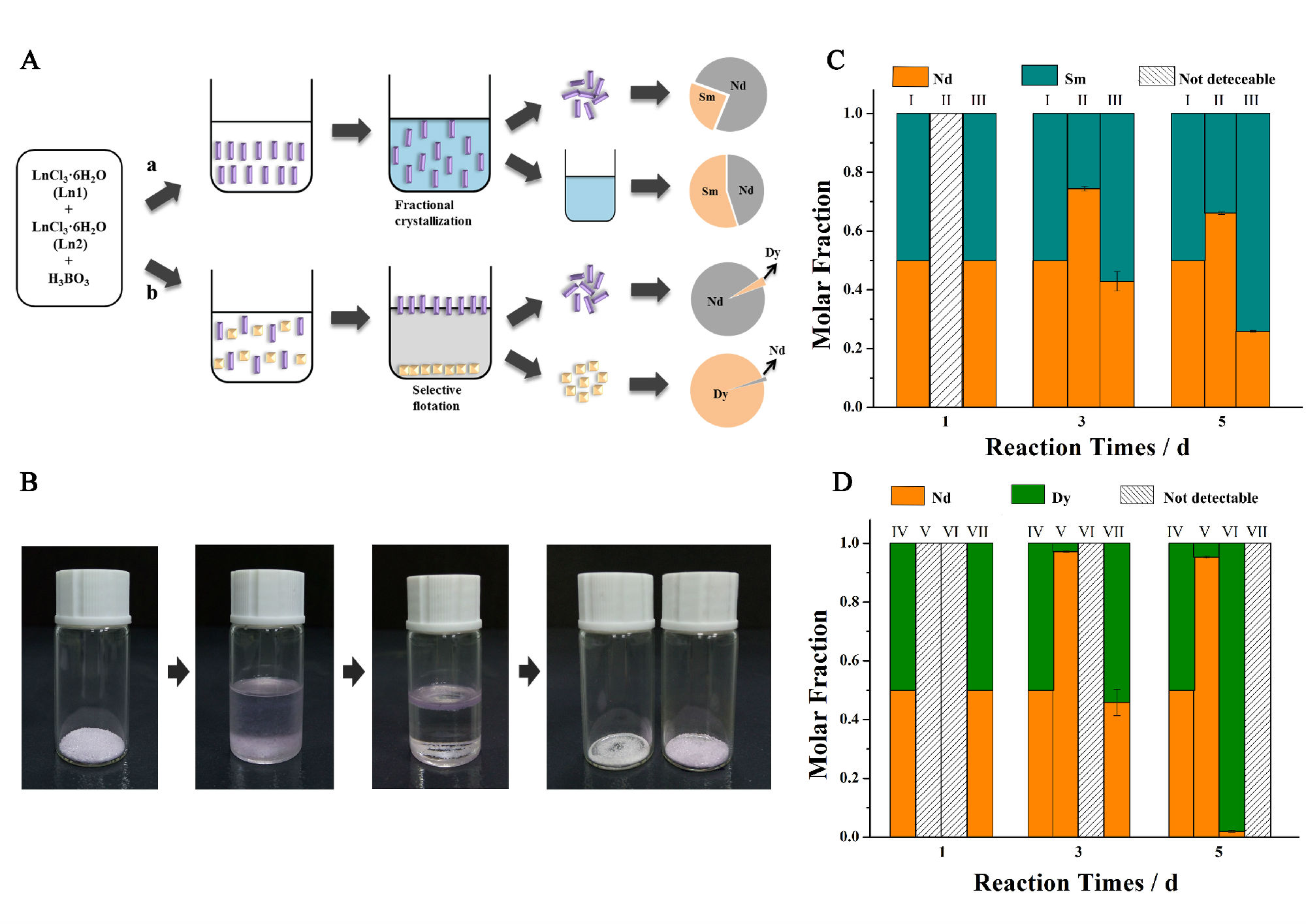 Lanthanides possess similar chemical properties rendering their separation from one another a challenge of fundamental chemical and global importance given their incorporation into many advanced technologies. New separation strategies combining green chemistry with low cost and high efficiency remain highly desirable. We demonstrate that the subtle bonding differences among trivalent lanthanides can be amplified during thecrystallization of borates, providing chemical recognition of specific lanthanides that originates from Ln3+ coordinationalterations, borate polymerizationdiversity, and soft ligand coordinationselectivity. Six distinct phases were obtained under identical reaction conditions across lanthanide series,further leading to an efficient and cost-effectiveseparationstrategyvia selective crystallization. As proof of concept, Nd/Sm and Nd/Dy were used as binary models to demonstrate solid/aqueous and solid/solid separation processes. Controlling the reaction kinetics gives rise to enhanced separation efficiency ofNd/Sm system and a one-step quantitative separation of Nd/Dy with the aid of selective density-based flotation.