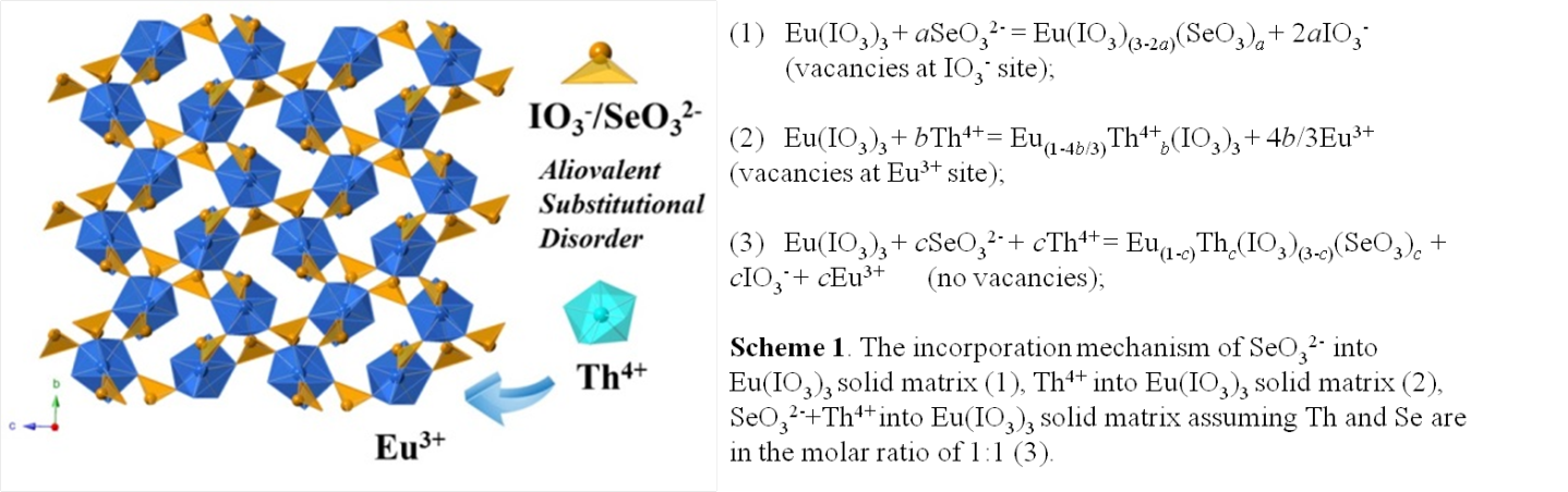 本工作报导的晶体Th(IO3)2(SeO3)是首次发现IO3-和SeO32-这两种异价的阴离子在同一锕系固溶体中相互置换,结合上海光源BL14W线站对其结构与存在形式进行详细的探索。与此同时,在另一类锕系固溶体Eu(IO3)3中,我们证明了当Th4+存在时,IO3-的位点可以被SeO32-充分替代,电荷平衡机制在裂片产物与锕系固溶体的形成中起主导作用。这些研究结果对于核裂变产物129I和79Se有了更深的认识:它们可以同时存在于同一个固体基质中,并且可以通过固溶体的方式将它们掺杂到彼此的固相中以阻滞它们的迁移。