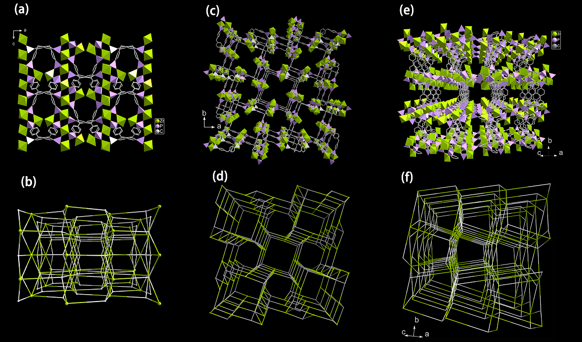图1. 有机膦酸锆MOFs单晶结构及拓扑