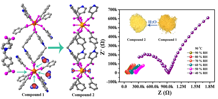 本中心白转玲同学设计合成的MOF在水存在下会发生水诱导的晶相转变,从而改变晶体内部的氢键网格构成,大大提高晶体的质子导电能力,该工作已发表在ACS的Cryst. Growth Des.杂志上。