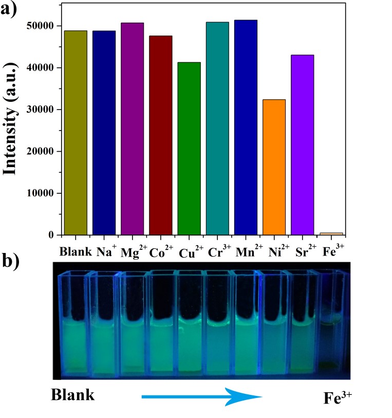 Fig.1 a) Luminescence intensity of 1 dispeared into different meatl salt solutions (excited at 364 nm, monitered at 521 nm). b) Correspongding luminescence photograph of 1 immersed in these metal salt solutions (excited at 365 nm).