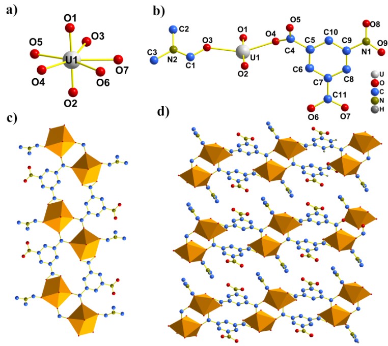 Fig. 2 Crystal structure of 1, hydrogen atoms are omitted for clarity: (a) Coordination environment of U1. (b) Asymmetric unit of UO2(C8H3O6N)·DMF. (c) The 1D chain of compound 1 composed of 5-Nitroisophthalic acid linked asymmetric units. (d) The packing of 1D chains in 1. (H atoms are omitted for clarity) Atom colours: U = green, O = red, C = black, N = blue.
