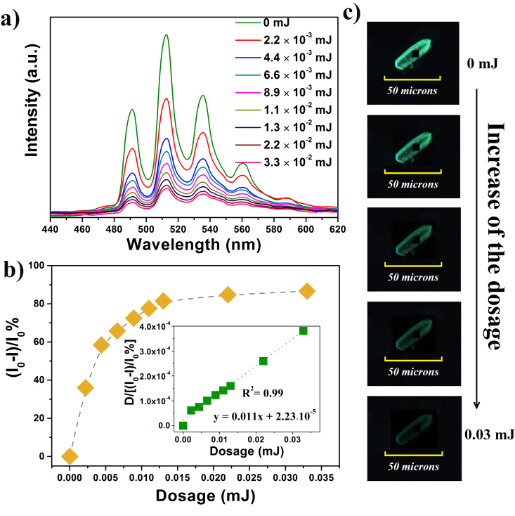 Figure 1. a) Dosage dependent luminescence spectra of compound 1 performed on a single crystal to showing the quenching effect under 365 nm UV light. b) The correlation between the quenching ratio and radiation dosage. c) is the corresponding luminescence photographs of a single crystal.