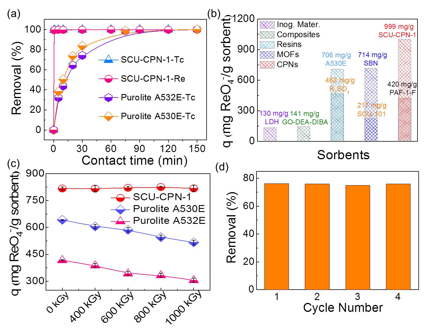 图2 SCU-CPN-1材料对TcO4-/ReO4-的吸附性能。(a) 动力学,(b) 吸附容量,(c) 耐辐照性,(d) 3.0M硝酸条件下循环使用。
