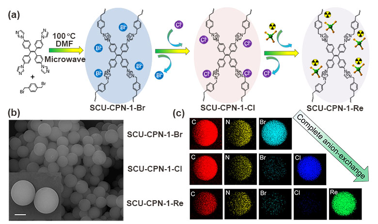 图1 SCU-CPN-1材料:(a)合成路线、(b) SEM和(c) 元素mapping。