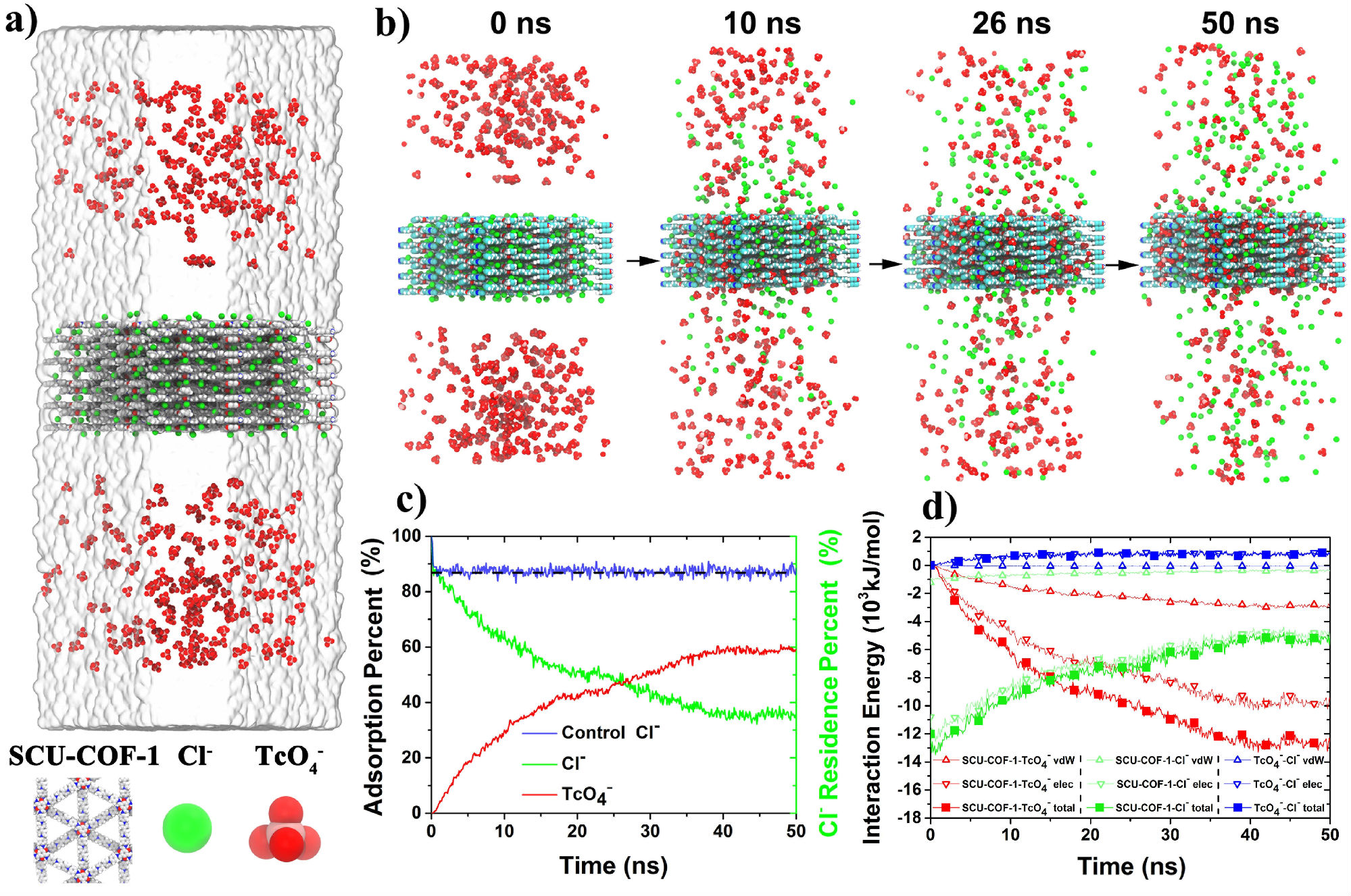 图3. SCU-COF-1对99TcO4-吸附过程的分子动力学模拟(Molecular Dynamics Simulation).