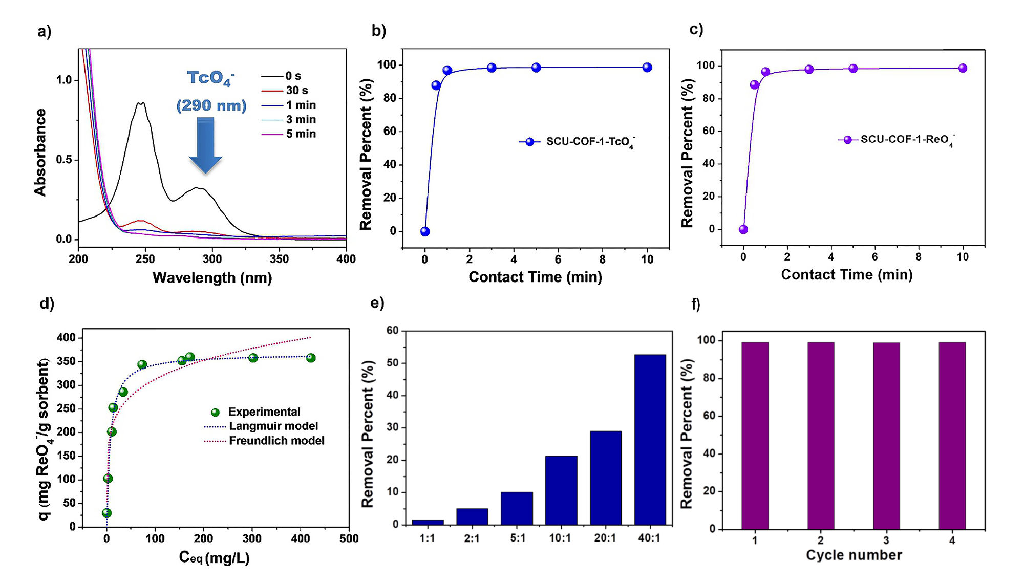 研究发现,SCU-COF-1具有超高的酸稳定性 (3 M HNO3中仍能维持稳定)、大剂量的耐辐照性 (600 kGy的β或γ射线照射后维持稳定)。吸附实验进一步表明:SCU-COF-1不仅具有极快的吸附动力学(可在1分钟内达到吸附平衡)、超高的吸附容量(稍高温度下对ReO4-, 99TcO4-的替代物,的吸附容量达702.4 mg/g ),更重要的是,SCU-COF-1对99TcO4-具有非常良好的选择性。进一步实验表明SCU-COF-1具有能在模拟的实际高酸性乏燃料后处理的溶液( 3 M硝酸)和美国遗留核场址的低活性废液中分离99TcO4-的能力。