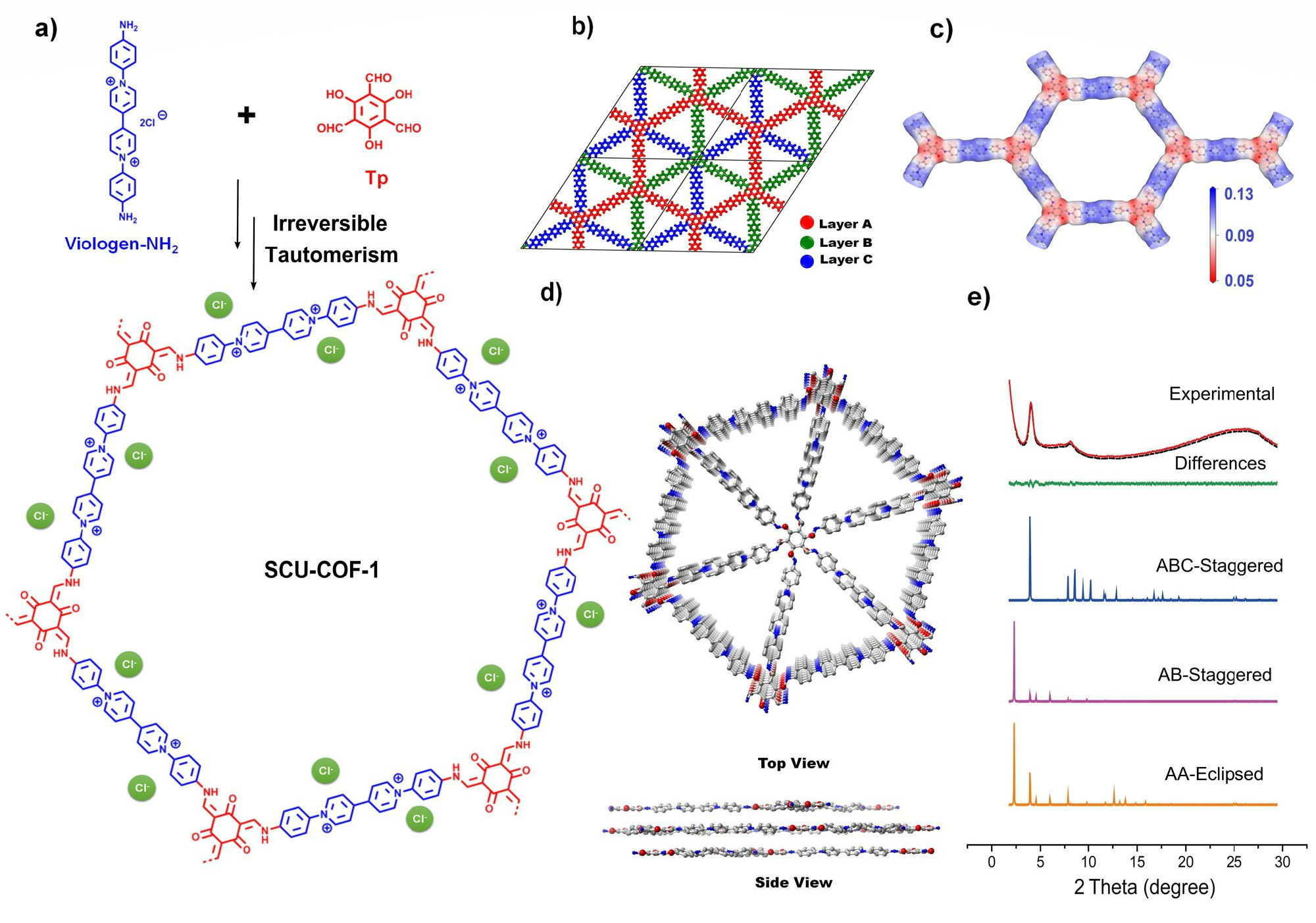 图1. SCU-COF-1的合成、结构模拟及粉末衍射示意图