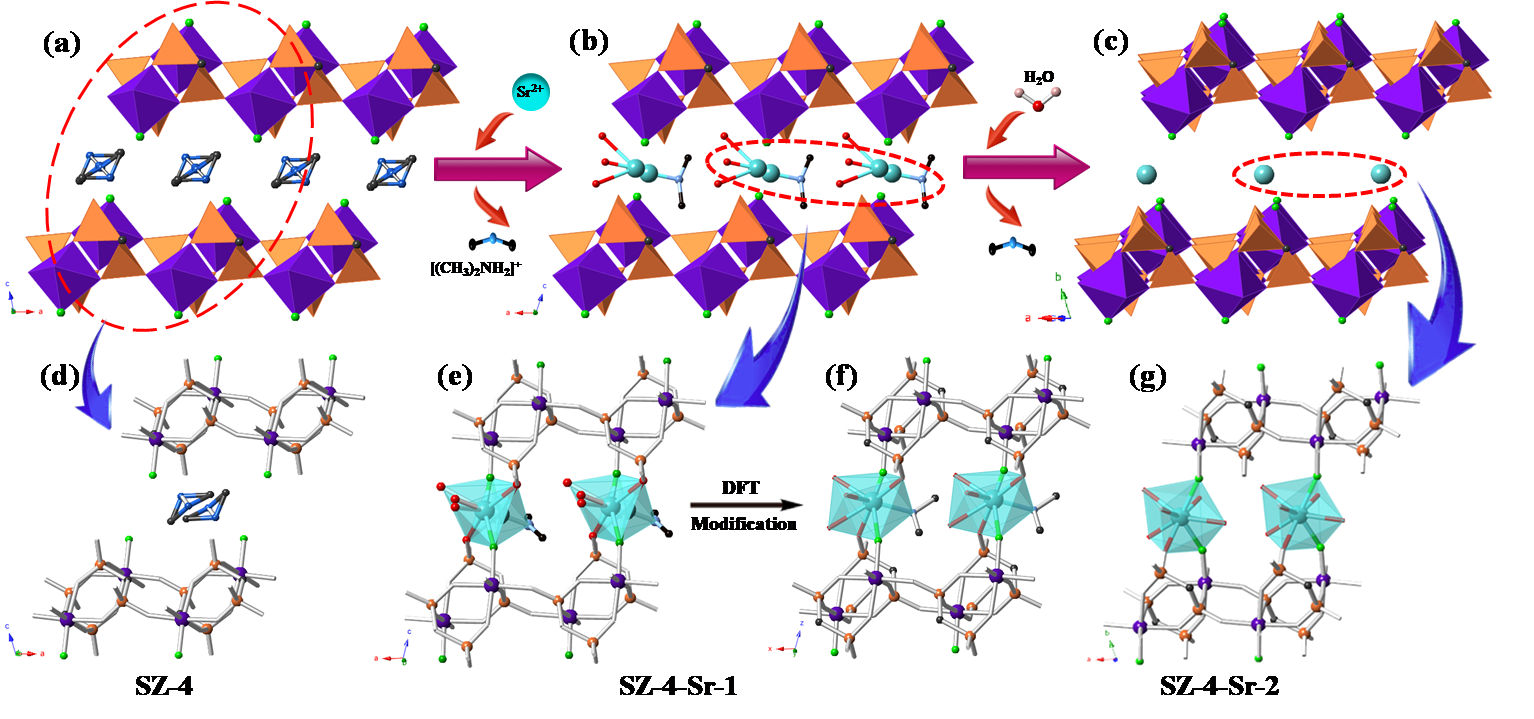 进一步的,通过对所得吸附后晶体的单晶解析,并结合DFT理论计算,阐明了SZ-4对Sr高效去除的机理(图3)。吸附过程分为两步进行:第一步,因为Sr作为软离子,倾向于与N离子配位,所以Sr结合2-3个配位水进入结构中与二甲氨配位,形成中间态的吸附结构;第二步,Sr的配位水数目增加,二甲氨粒子被交换出层间,此时形成稳定的终态。在此过程中所有的反应均是符合热力学过程的。通过二甲氨的中间交换策略,SZ-4实现了对Sr的吸附去除+固化,具有较大的Sr去除应用前景。