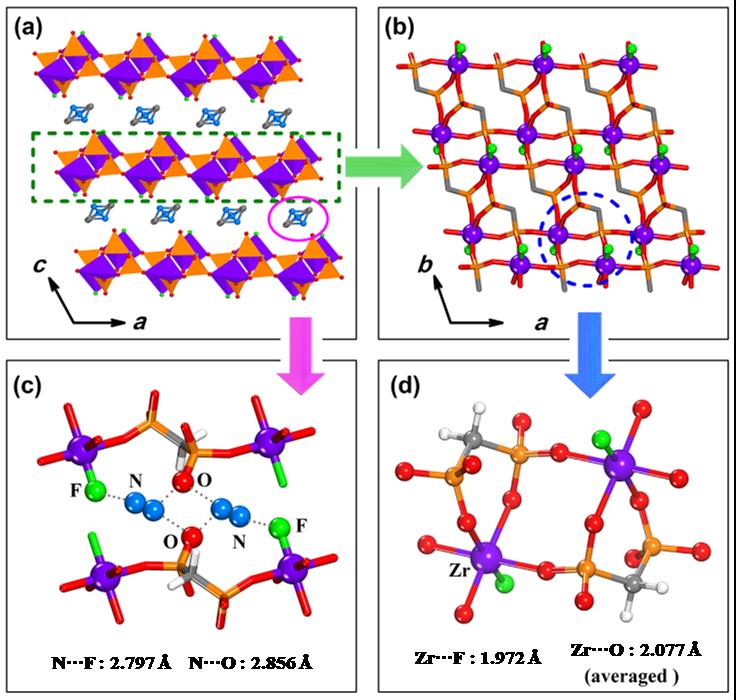 基于此,本团队将膦酸锆用于90Sr的环境去除中,创新性的将软元素N引入到去除过程中,大大提高了90Sr的选择性去除性能,并首次通过单晶解析和DFT理论计算详细阐明了其对Sr的去除机理,为后续材料设计合成提供了有力参考,相关工作在国际顶级期刊Chem上发表。本工作报道了一例新型层状膦酸锆材料(SZ-4,图1),SZ-4的结构层由Zr原子和亚甲基二磷酸构筑,在层间充满可用于离子交换的二甲氨阳离子([NH2(CH3)2]+)。