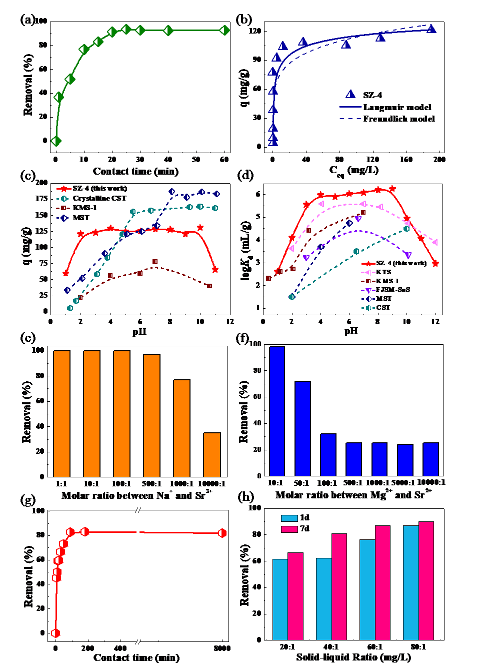 吸附实验表明SZ-4对Sr的去除容量达到117.9±3.8 mg/g,且表现出极好的选择性,超快的动力学,在pH为4时,SZ-4亦能在20min内去除水中92%的Sr。值得一提的是,SZ-4在酸性情况下对Sr的去除能力普遍优于其它材料(图2c),在pH为2时,能到达121 mg/g,几乎是知名材料KMS-1(23 mg/g)的5倍。在去除深度上,SZ-4在pH为1-12的范围内,几乎优于所有其它知名材料(图2d),其最高Kd值可达4.06×106 mL/g,这高出了KMS-1(1.58×105 mL/g)一个数量级。为了验证SZ-4对90Sr的实际去除效果,我们将SZ-4用于真实海水的90Sr去污实验,结果如图2g、h所示,如图示,SZ-4能在一个小时内去除海水中80%的放射性90Sr。最终能去除海水中90%的90Sr。