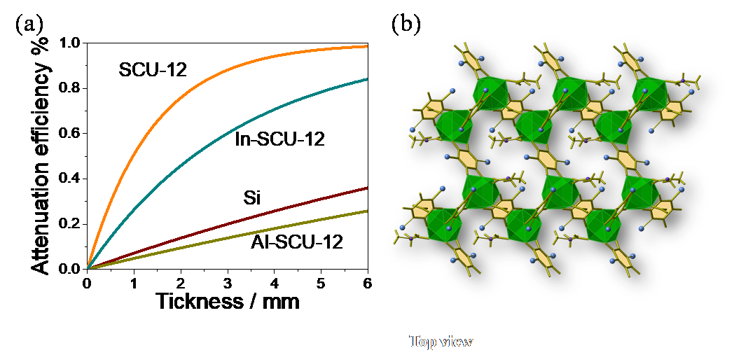 图1. a. 利用金属调节框架材料对60 keV X射线的吸收能力;b. SCU-12结构图