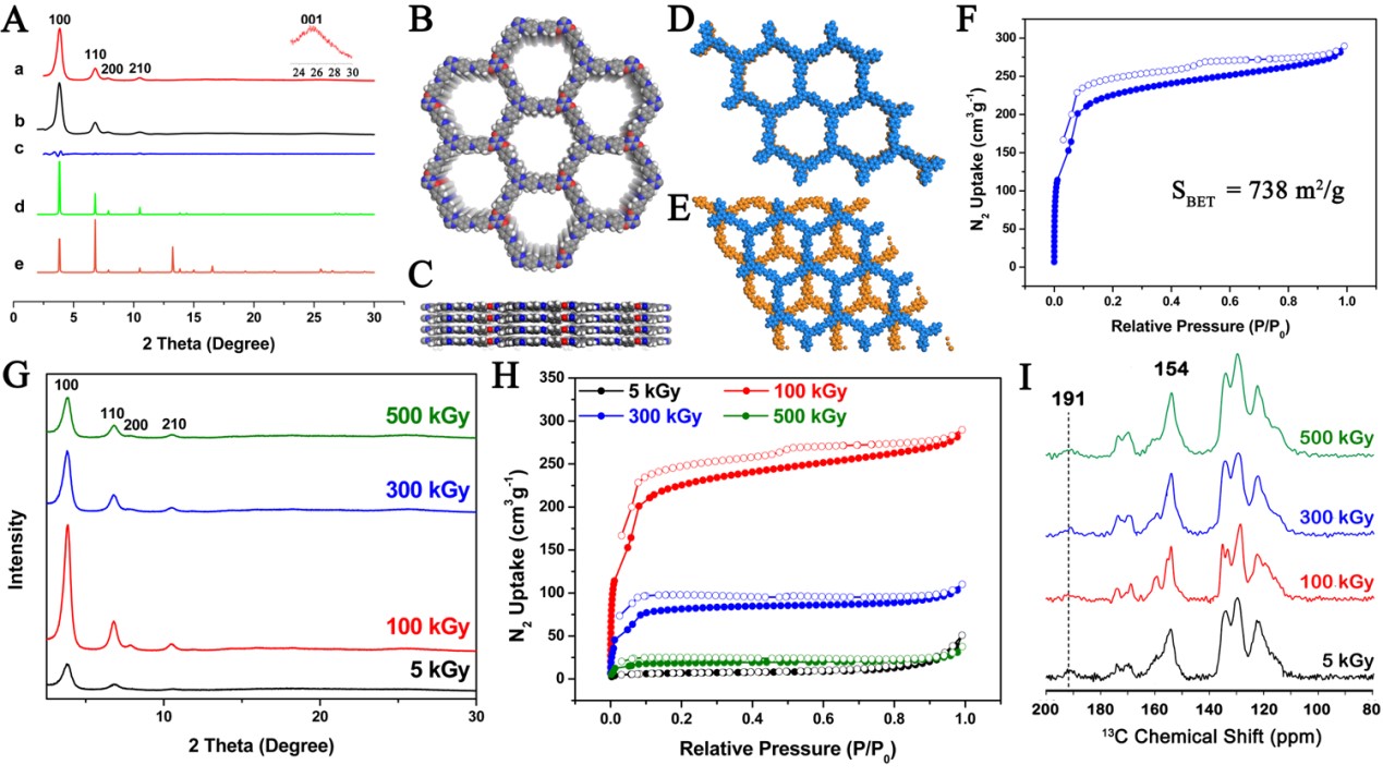 本研究团队从工业化方面入手,致力于目前已有的工业化技术,探索可行的工业化合成路径,解决COFs在工业级规模上合成的难题。辐射技术作为一项成熟的产业化技术,在辐射灭菌、辐射加工、辐射改性等领域具有广泛应用。高能射线与物质相互作用,经历复杂的物理-化学过程后,产生一系列活性物种。在化学材料制备方面,这些活性物种主要用于合成无机纳米颗粒和有机高分子聚合物及高分子材料表面改性,而在结晶多孔材料合成方面仍是一片空白且传统观点认为高能射线仅仅只能破坏晶体材料的长程有序性。基于此,本研究团队经过不断地尝试与摸索,首次用电子束辐照合成出晶态多孔材料COFs。该方法反应条件温和(室温室压)、快速(160 s)、产率高、合成出的COFs纯度高、结晶性能优异(图1)。该方法也具有普适性,不仅适合于典型的刚性COFs,而且也适合于传统方法难以合成的新的柔性COFs,也适合其它更为传统的多孔晶态材料(MOFs和沸石)的合成。