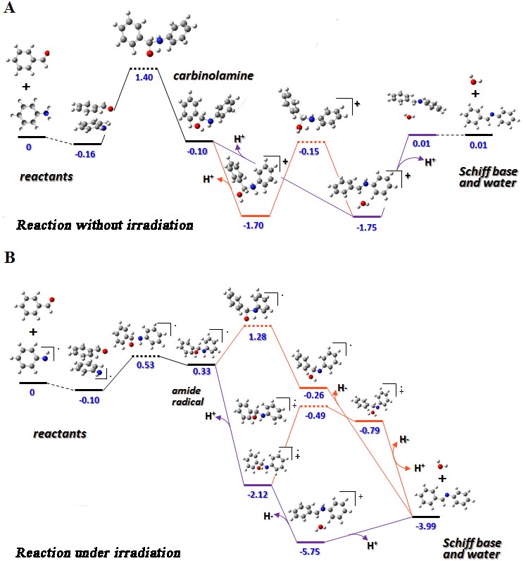 图3 未辐照(A)与辐照(B)体系下的反应路径能线图