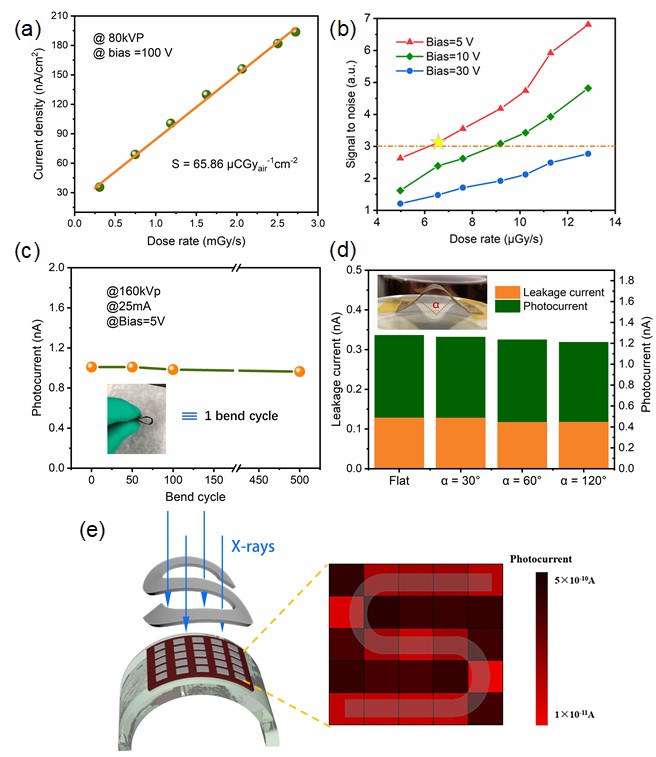 为了探究柔性成像方面的可能性,该团队测试了样品在弯曲工况条件下性能的稳定性,实验得到在不同的弯折角度和弯折次数的情况下样品都能较好地保持之前的性能。并且进一步地尝试了弯曲状态成像模拟实验,利用100px×100px的薄膜完成了5×5的像素级成像,把每个像素点的光电流大小按照颜色阶梯化处理得到的图像能够表现出覆盖在上面的“S”形铅片的形状。该尝试给柔性辐射探测领域提供了一种新的可能性。