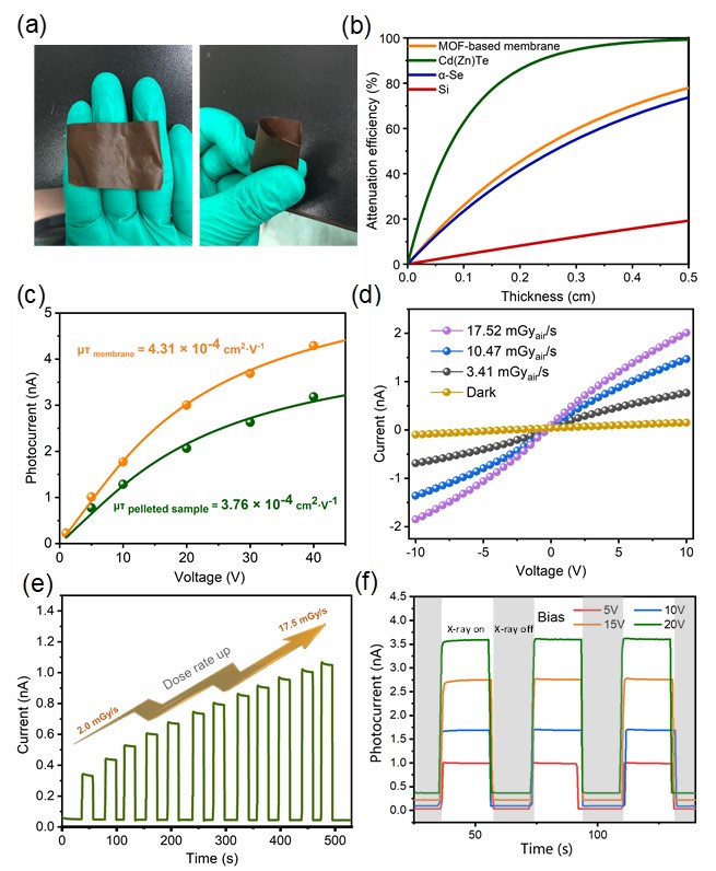 该工作通过混合基质薄膜的手段有效克服以往高压制备多晶探测器晶界等因素带来的缺点,从而提升了载流子迁移效率,得到了多晶压制探测器所不具备的探测性能。得到了较高的X射线探测灵敏度(65.86 μCGyair-1cm-2)和相较于压制晶片迁移率寿命积的提升,同时检测下限低至6.553 µGyair/s。