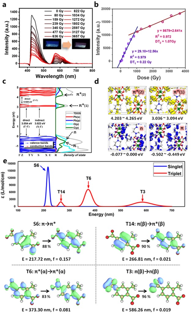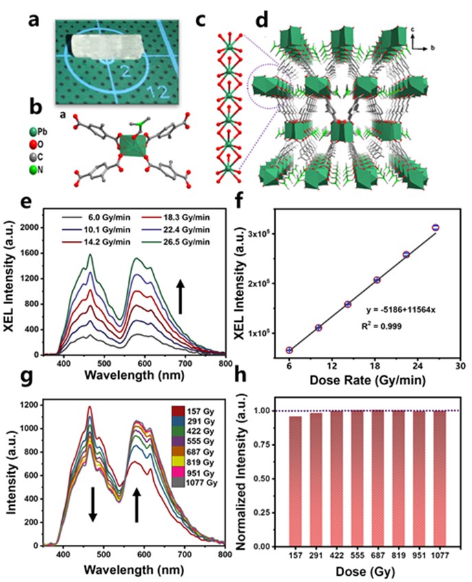 该工作以Pb元素为MOF金属中心,使材料拥有高X射线阻滞系数(比传统材料高两个数量级)。根据软硬酸碱理论,铅与2-甲基对苯二甲酸配体合成了大尺寸的MOF单晶(SCU-200)。该工作在研究SCU-200的闪烁体性能时,验证了该材料X射线激发光谱(XEL)与剂量率呈良好的线性关系。同时,XEL呈现蓝色荧光下降,红色荧光上升的特殊现象促使该团队进一步地探索材料荧光与所受剂量关系。