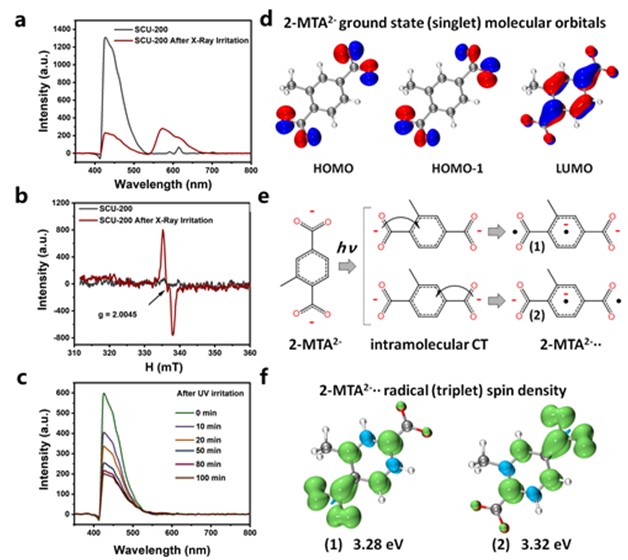 对比紫外和X射线作用的荧光光谱,该团队发现SCU-200可以选择性识别高能射线。EPR实验表明材料在产生新峰时伴随着自由基的生成。通过DFT理论计算,该团队认为MOF的框架结构和共轭苯环的作用下,配体在参与配位后更能稳定住辐射诱导的自由基,从而能够观察到新的荧光。
