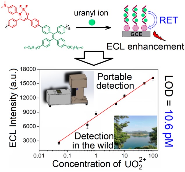 图1. 聚集诱导发光(AIE)活性聚合物点(Pdots)ECL探针用于环境中铀酰的高灵敏度便携式监测。(Copyright 2020, Wiley Online Library.)