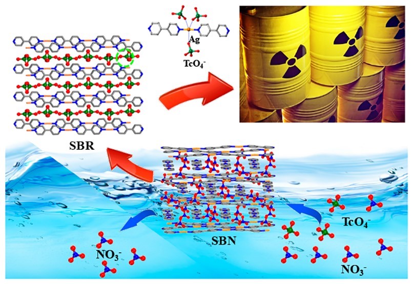 We report on of the most efficient scavenger materials, a cationic crystalline coordination polymer SBN for trapping ReO4-, a surrogate for 99TcO4-, as an anionic radioactive contaminant of great concern. The uptake capacity for ReO4- reaches 786mg/g, a value noticeably higher than the stats of art anion-exchange resins and other inorganic or hybrid anion sorbents. Once being captured, ReO4- is greatly immobilized, as most no ReO4- can be eluted using large excess of nitrate, carbonate and phosphate anions. The processes are featured by a complete and irreversible single-crystal to single-crystal structural transformation from SBN to the ReO4- incorporated phase (SBR). The coordination environments of NO3- and ReO4- probed by single-crystal structure clearly unravel the underlying mechani**, where each ReO4- in SBR binds to multiple Ag+ sites forming strong Ag-O-Re bonds, and to 4,4’-bipyridine through a dense hydrogen bond network. These structural insights lead to a significant difference in solubility product constants between SBN and SBR, which is further confirmed by first principle calculations showing a large binding energy difference of 35.61kcal/mol. To the best of our knowledge, SBR is the least soluble perrhenate/pertechnetatesalt reported, which may be considered as a potential waste form for direct immobilization of TcO4-.