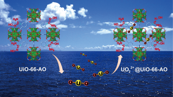 Enrichment of uranyl from seawater is crucial for the sustainable development of nuclear energy but current uranium extraction technology suffers from multiple drawbacks of low sorption efficiency, slow uptake kinetics, or poor extraction selectivity. Herein, we prepared the first example of amidoxime appended metal-organic framework UiO-66-AO by post-synthetic modification method for rapid and efficient extraction of uranium from seawater. UiO-66-AO can remove 94.8% of uranyl ion from Bohai seawater within 120 min and 99% of uranyl ion from Bohai seawater containing extra 500 ppb uranium within 10 min. The uranyl sorption capacity in real seawater sample was determined to be 2.68 mg/g. In addition, the recyclability of UiO-66-AO framework was demonstrated for at least three adsorption/desorption cycles. The origin for the superior sorption capability was further probed by extended X-ray absorption fine structure (EXAFS) ****ysis on the uranium-sorbed sample, suggesting multiple amidoxime ligands are able to chelate uranyl(VI) ions, forming a hexagonal bipyramid coordination geometry.