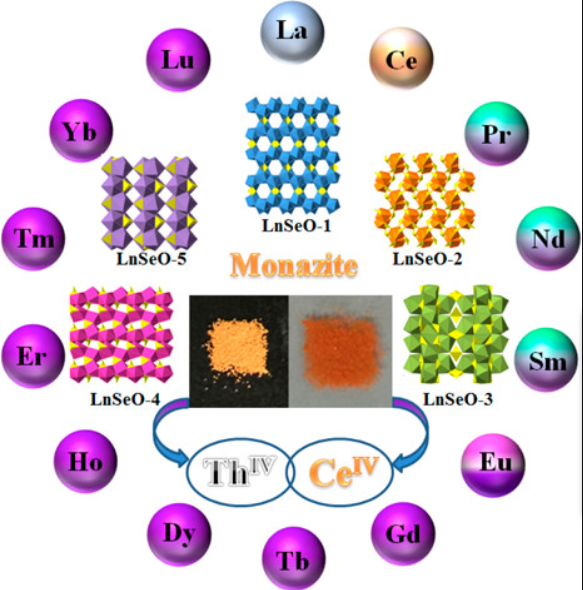 The coexistence of radioactive contaminants (e.g., thorium, uranium, and their daughters) in rare earth minerals introduces significant environmental, economic, and technological hurdles in modern rare earth production. Efficient, low cost, and green decontamination strategies are therefore desired to ameliorate this problem. We report here a single-step and quantitative decontamination strategy of thorium from rare earths based on a unique periodic trend in the formation of crystalline selenite compounds across the lanthanide series, where Ce(III) is fully oxidized in situ to Ce(IV). This gives rise to a crystallization system that is highly selective to trap tetravalent f-blocks while all other trivalent lanthanides completely remain in solution when coexist. These results are bolstered by first-principles calculations of lattice energies and an examination of bonding in these compounds. This system is contrasted with typical natural and synthetic systems, where trivalent and tetravalent f-block elements often cocrystallize. The separation factors after one round of crystallization were determined from binary systems of Th(IV)/La(III), Th(IV)/Eu(III), and Th(IV)/Yb(III) to reach 2.1 × 105, 1.2 × 105, and 9 × 104, respectively. Selective crystallization of thorium from a simulated monazite composite yields a separation factor of 1.9 × 103 with nearly quantitative removal of thorium