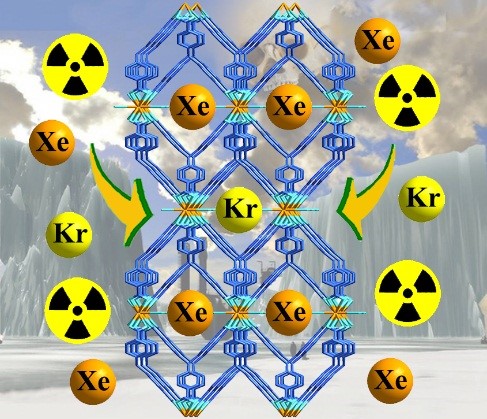 Actinide based metal‐organic frameworks (MOFs) are unique not only because compared to the transition metal and lanthanide systems, they are substantially less explored, but also owing to the uniqueness of actinide ions in bonding and coordination. We report here a new 3D thorium‐organic framework (SCU‐11) that contains a series of cages with an effective size of ca. 21~24 Å. Th4+ in SCU‐11 is 10‐coordinate with a new bicapped square pri** coordination geometry, which has never been documented for any metal cation complexes before. The bicapped position is occupied by two coordinated water molecules that can be removed to afford a very unique open Th4+ site, confirmed by X‐ray diffraction, colour change, thermogravimetry, and spectroscopy. The degassed phase (SCU‐11‐A) exhibits a Brunauer‐Emmett‐Teller surface area of 1272 m2 g‐1, one of the highest values among reported actinide materials, enabling it to sufficiently retain water vapor, Kr, and Xe with uptake capacities of 234 cm3 g‐1, 0.77 mmol g‐1, 3.17 mmol g‐1, respectively and a Xe/Kr selectivity of 5.7.